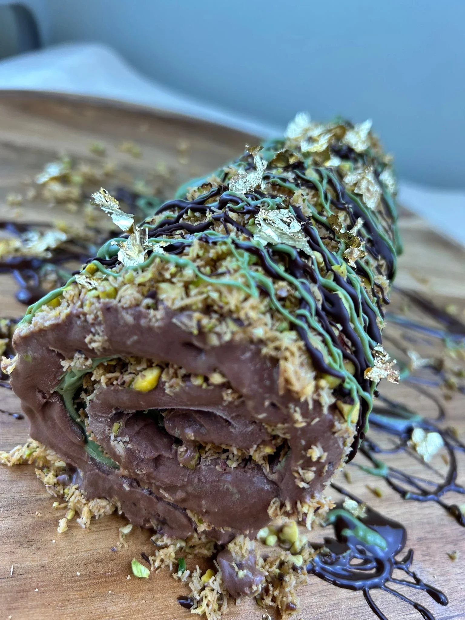 Dubai Chocolate Bouza is for the chocolate lovers. Imagine rich, creamy chocolate bouza filled with pistachio paste, then rolled in toasted Kataifi dough and crushed pistachios, finished with delicate gold leaves. It's decadent, irresistible, and absolutely unforgettable. Each roll is hand-crafted by our team, which means no two are exactly alike. A truly one of a kind dessert!