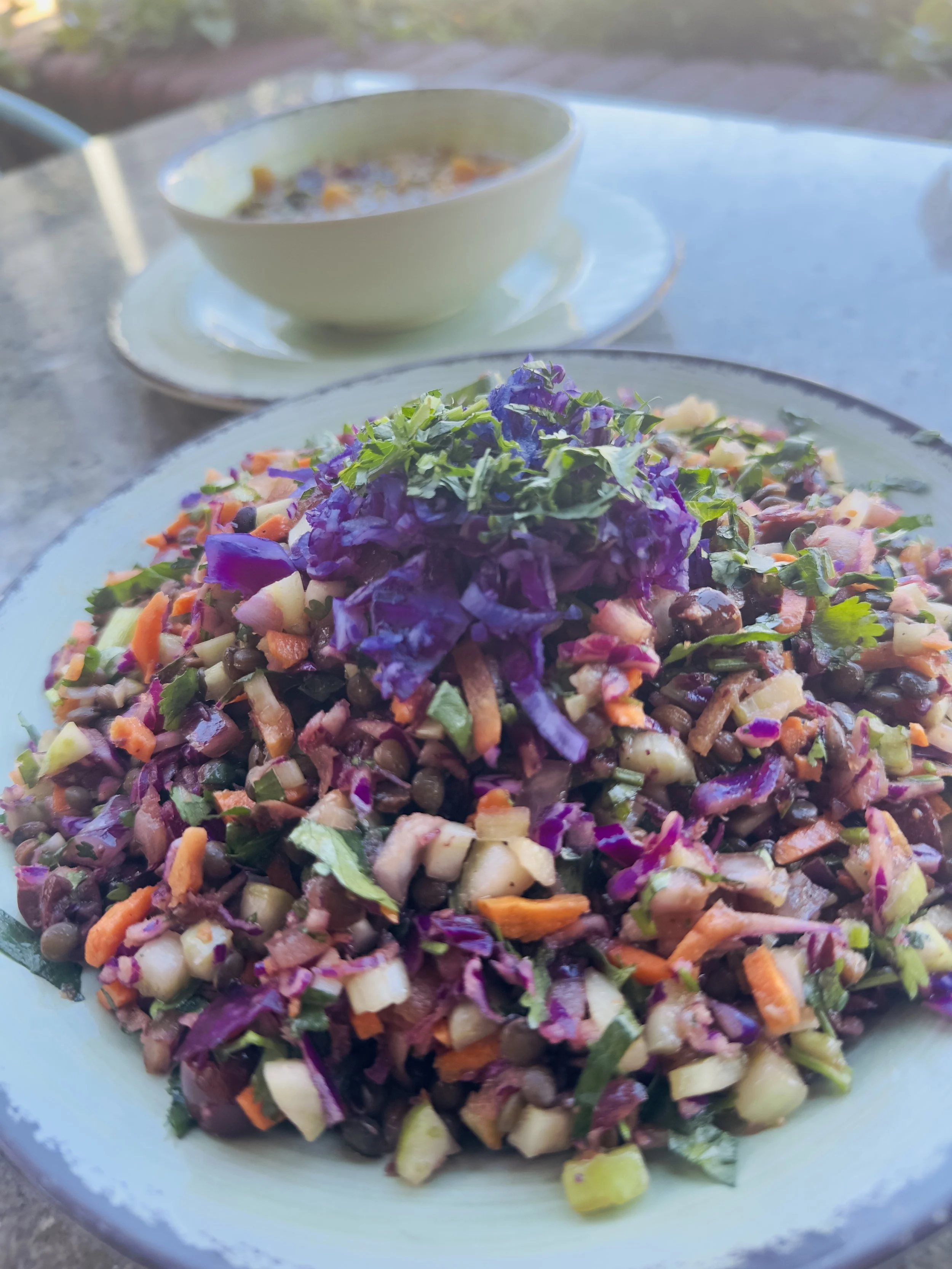 For those embracing plant-forward eating or seeking lighter options, our Harvest Lentil Salad is both vegan and gluten-free. French lentils mingle with red cabbage, celery, carrots, cilantro, and red onions, all dressed in a tangy pomegranate-carob molasses dressing. It's bright, satisfying, and perfect for January.